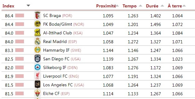 11-20名分别为:布拉加(葡超)、博德闪耀(挪超)、吉达联合(沙特联)、皇马(西甲,84分)、哈马比(瑞典超)、圣地亚哥(美职联)、锡尔克堡(丹麦超)、利物浦(英超,81.9分)、洛杉矶FC(美职联)和埃尔切(西甲)